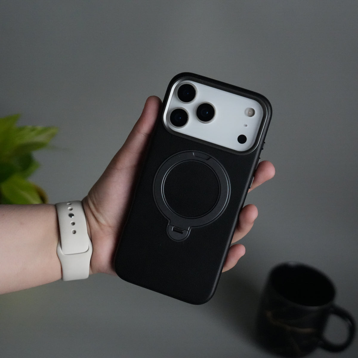 iPhone 17 Pro PU Leather Case with Metal Camera Frame & 360° Rotating Metal Stand