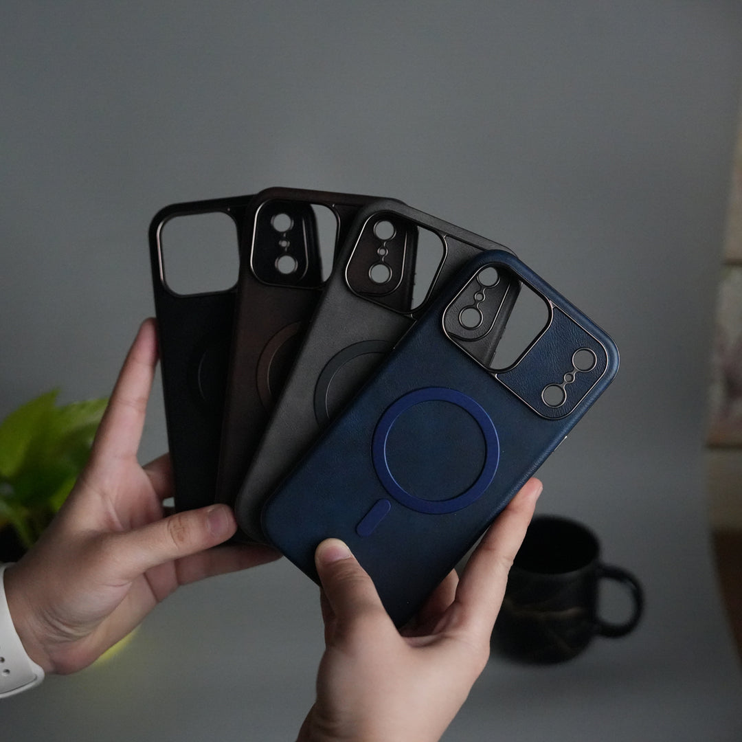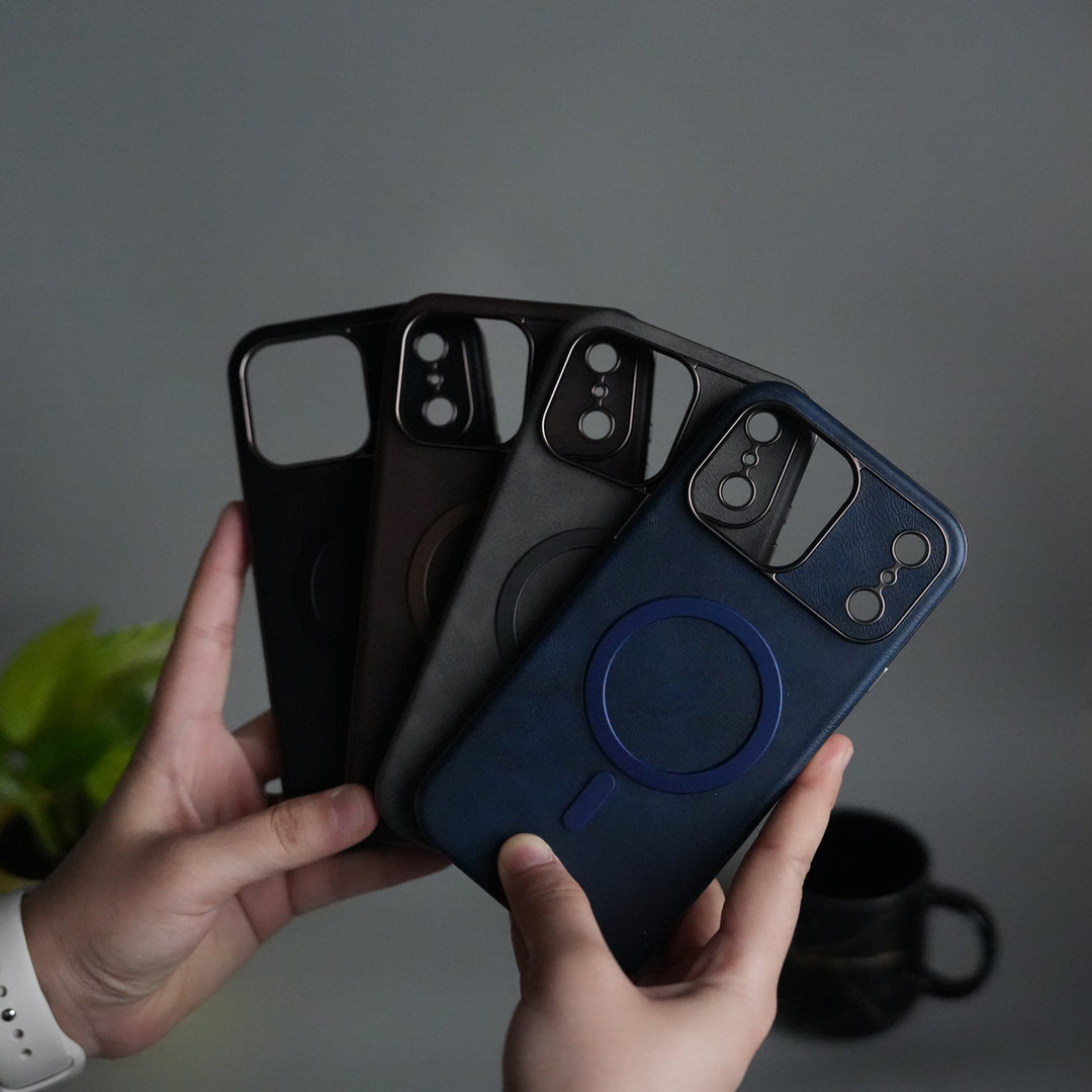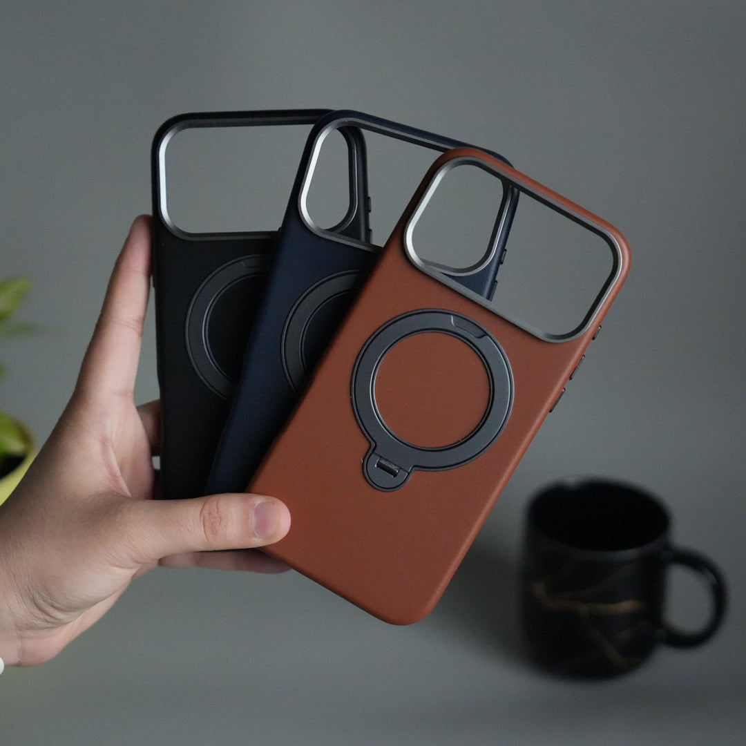 iPhone 16 Series Luxury Leather Magnetic Ring Case | Metal Camera Frame and Kickstand Cover