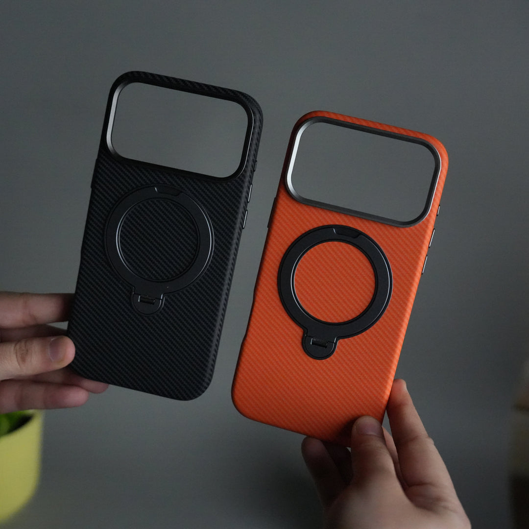 iPhone 17 Series Premium Orange Carbon Design Aluminium Metal Snap On Rotating Stand case