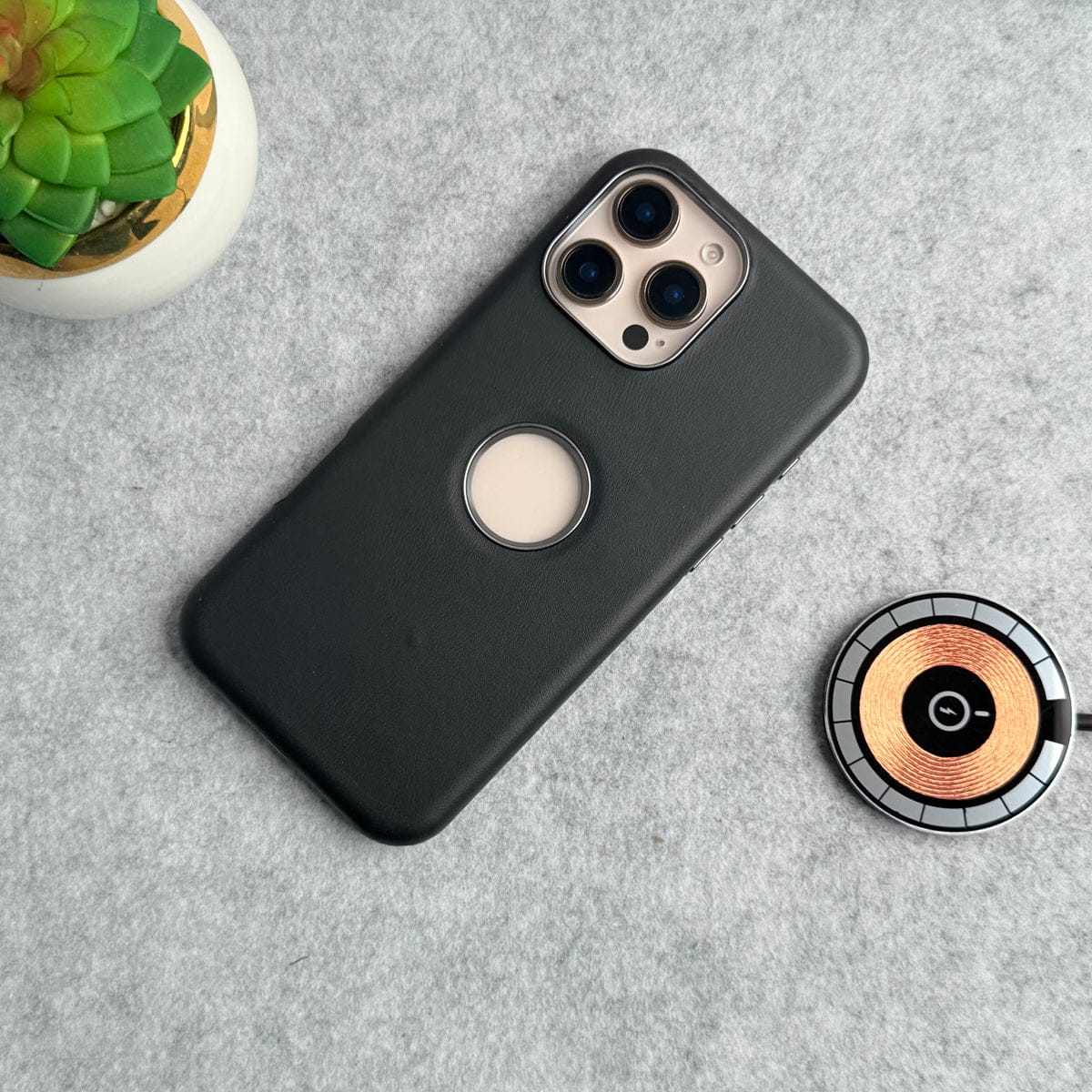 iPhone 15 Series Textured PU Leather Logo Cut MagSafe Case Cover