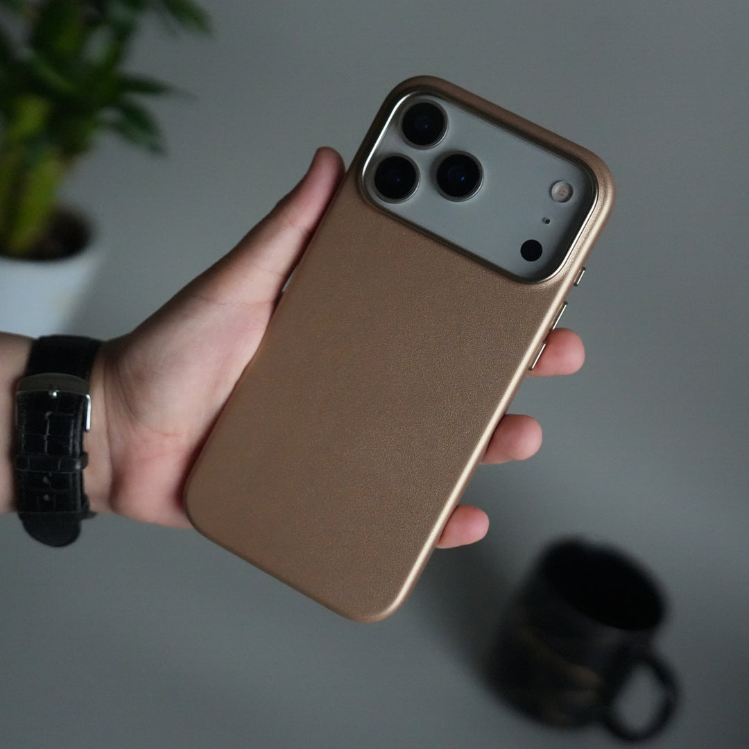 iPhone 17 Pro Max Premium PU Leather MagSafe Case | Metal Camera Frame Luxury Back Cover | Desert Gold