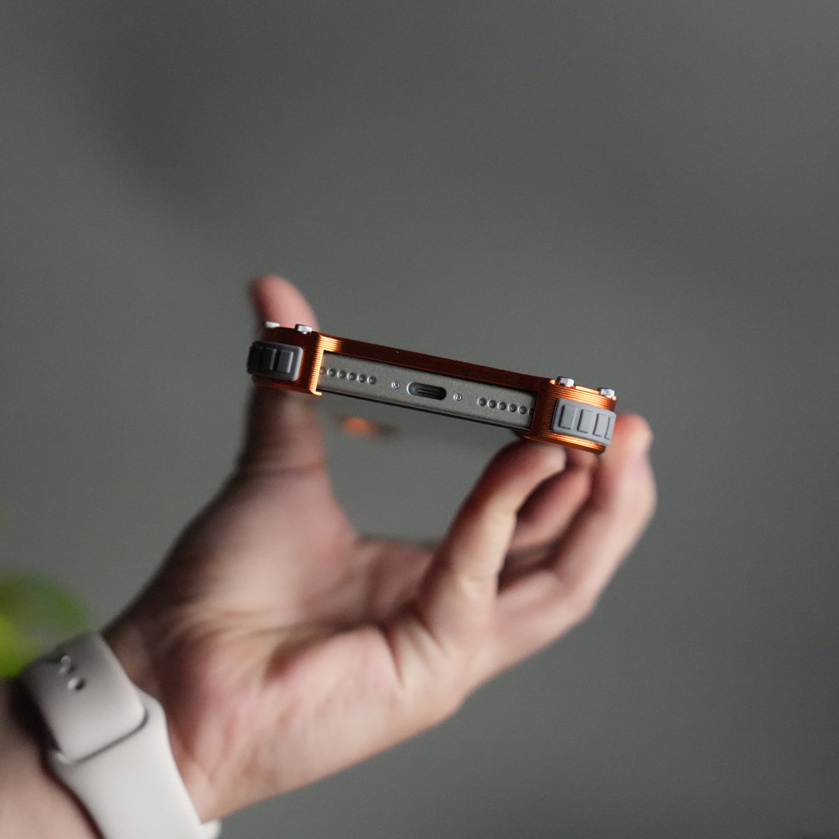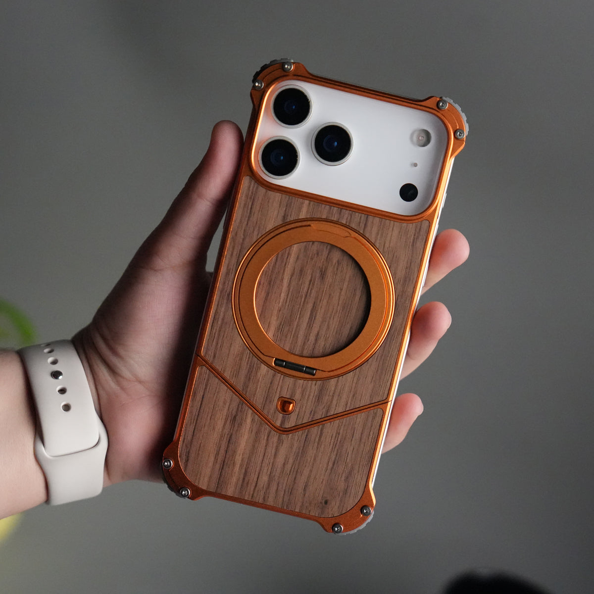 iPhone 17 Series Premium Orange Wooden Aluminium Metal Snap On Rotating Stand case