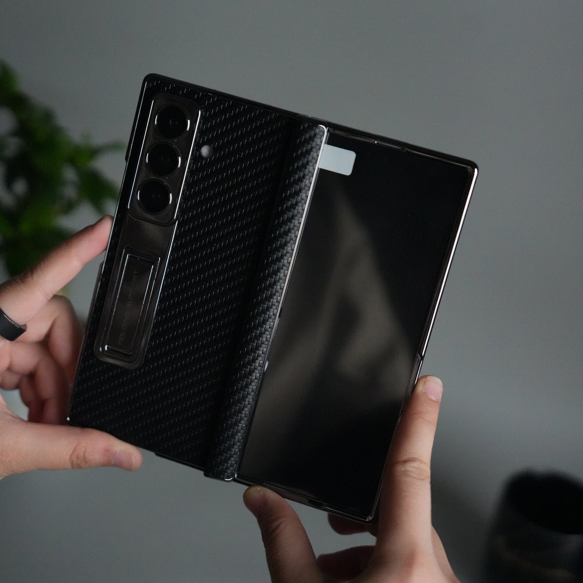 Bring unmatched elegance and protection to your Samsung Galaxy Z Fold 7 with this carbon fiber textured magnetic stand case featuring front glass protection.