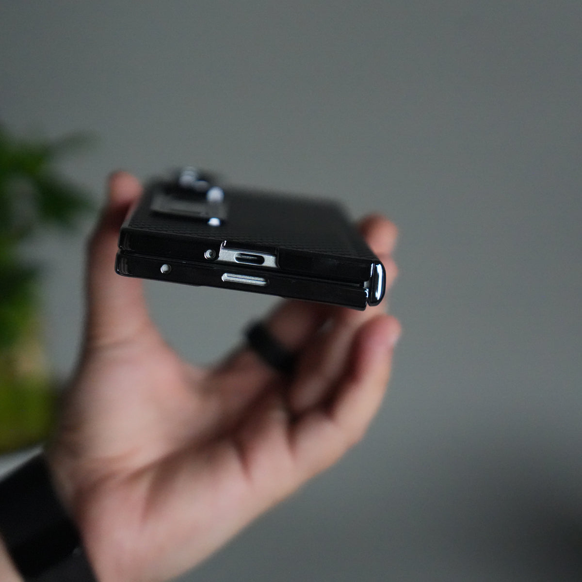 The luxury chrome-plated frame adds a stylish shine, while the carbon pattern back gives a sporty, premium look. Designed for durability and a perfect fold fit, this case ensures full 360° safety and hands-free convenience.