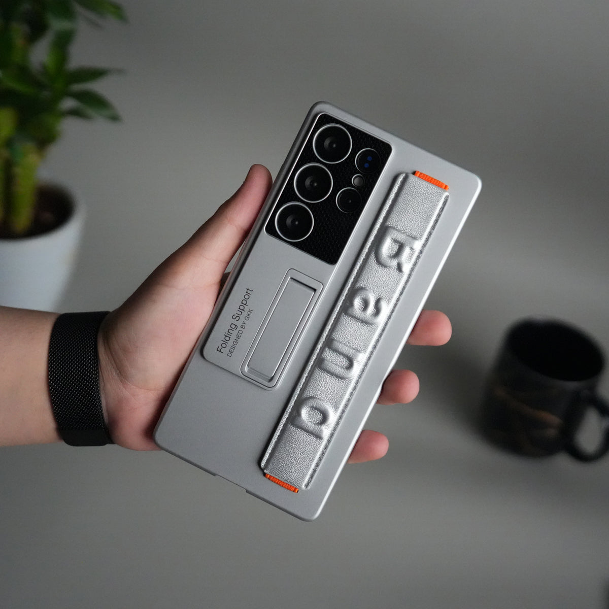 Get the perfect mix of style and functionality with this Galaxy S24 Ultra protective case. Designed with a premium band holder strap for a secure grip and one-hand use, plus a foldable kickstand for hands-free viewing, this case is built for convenience. The sleek finish with metallic accents adds a modern luxury touch while ensuring shockproof protection against drops and scratches.